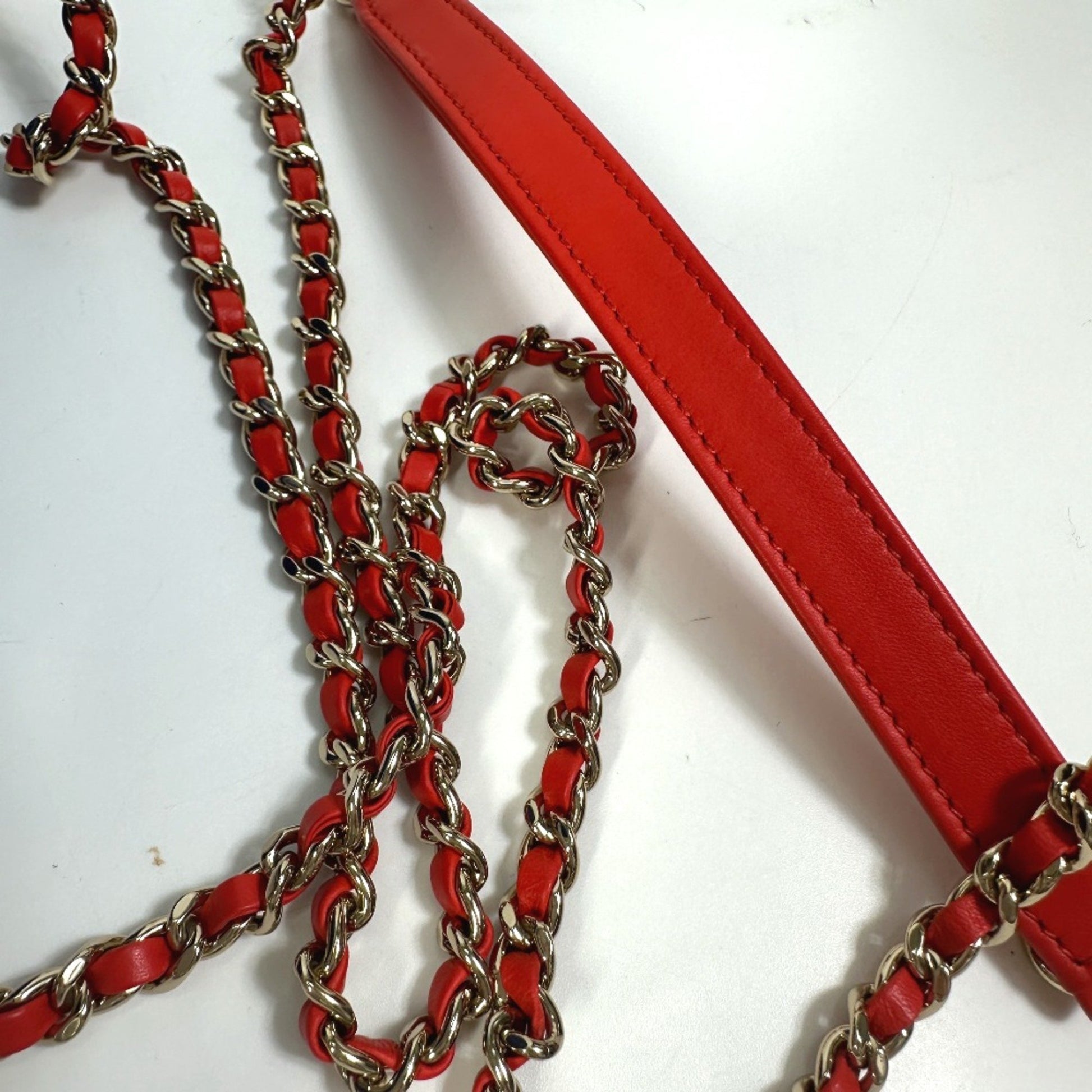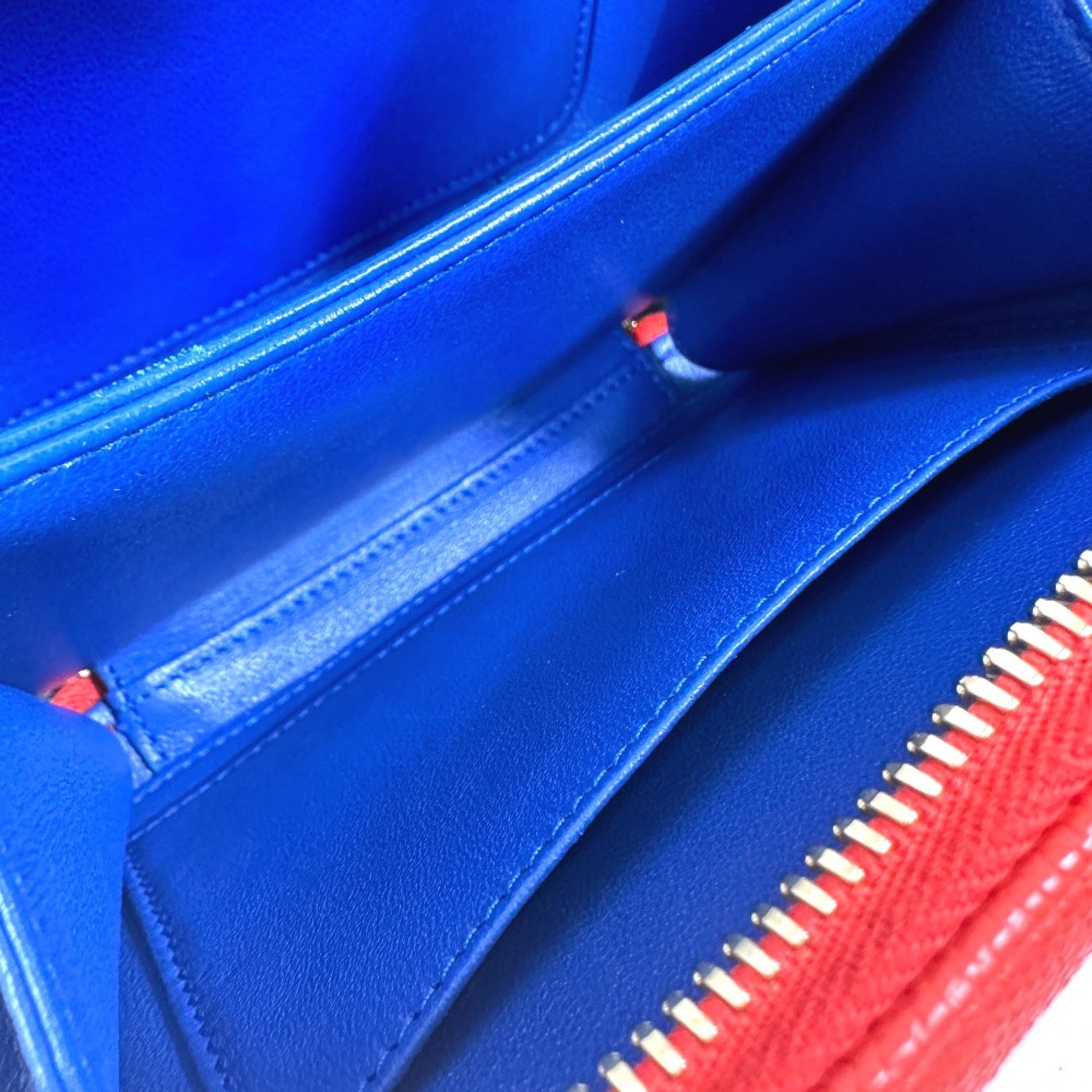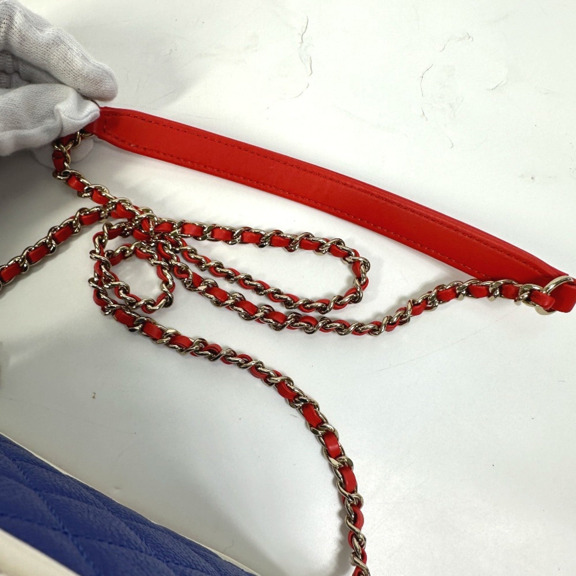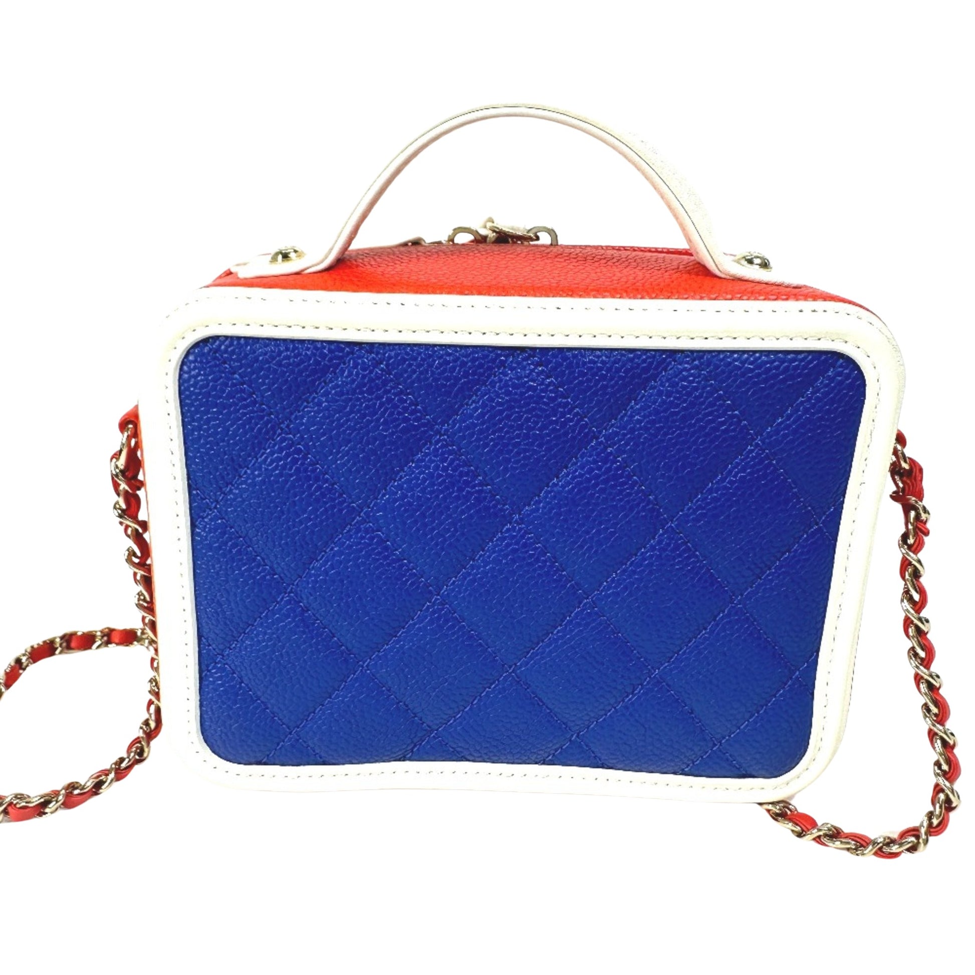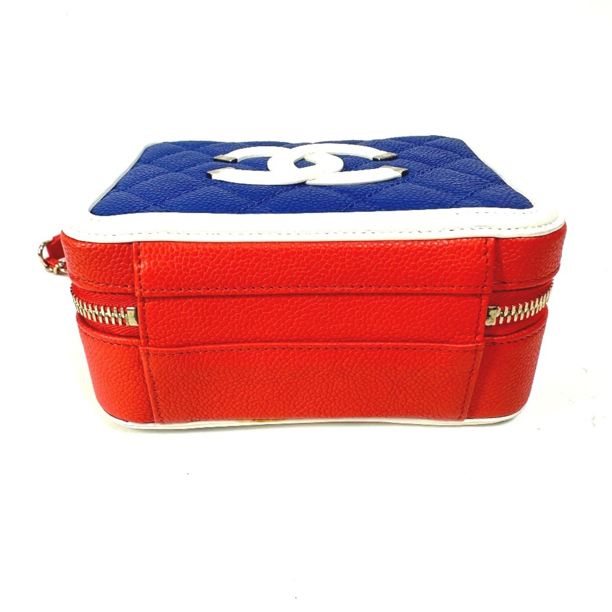 The Chanel CC Filigree shoulder bag is a stylish accessory, crafted from high-quality red and blue leather. Its unique design and vibrant color make it a standout piece.