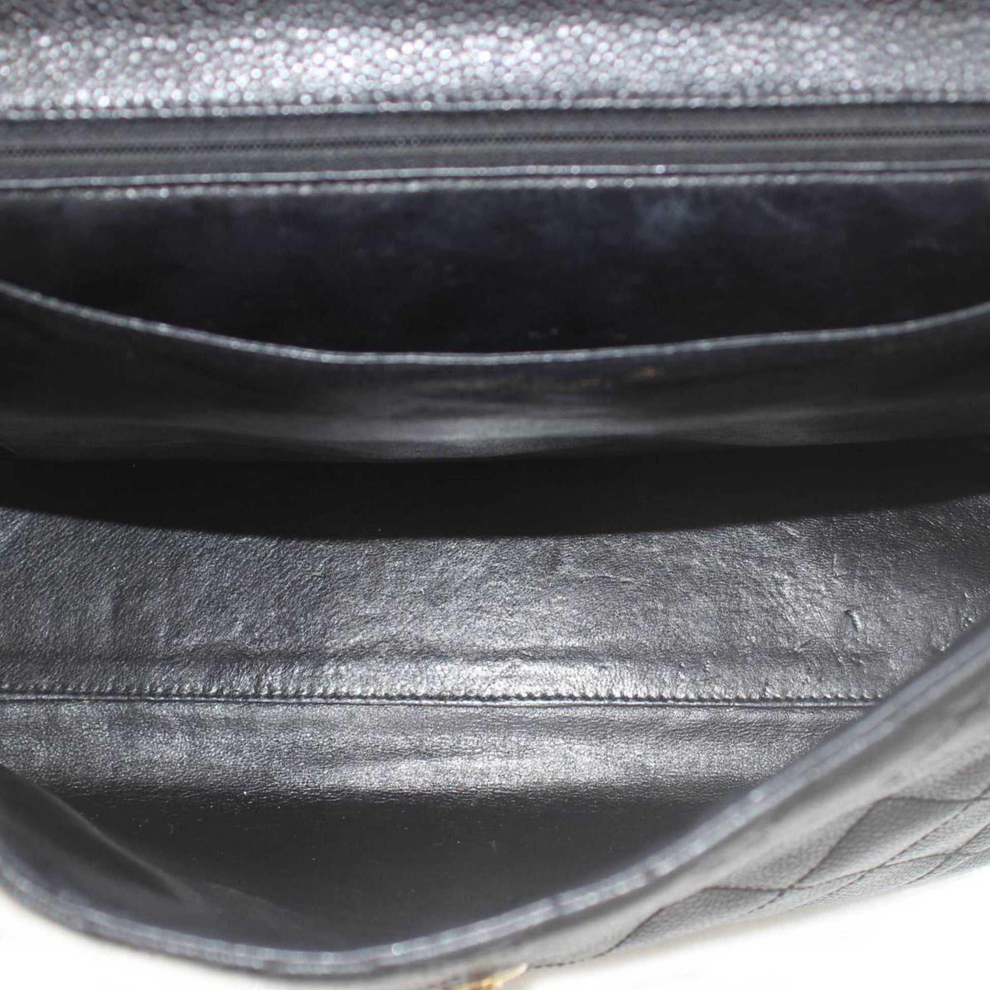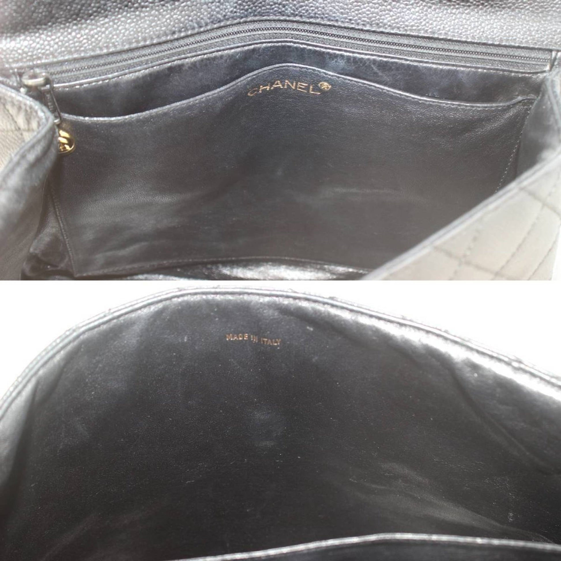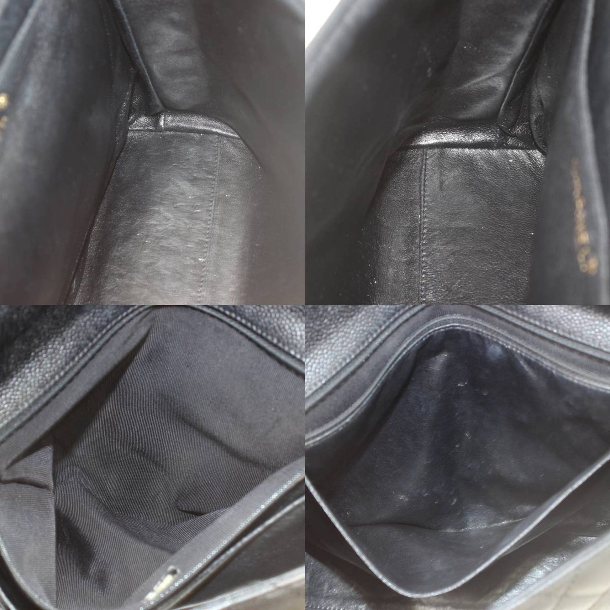 Overall, there are slight traces of use. The bag shows some creasing and wear on the exterior, with loose threads inside and a tear in the inner pocket. Despite these imperfections, the handbag remains in good condition.
