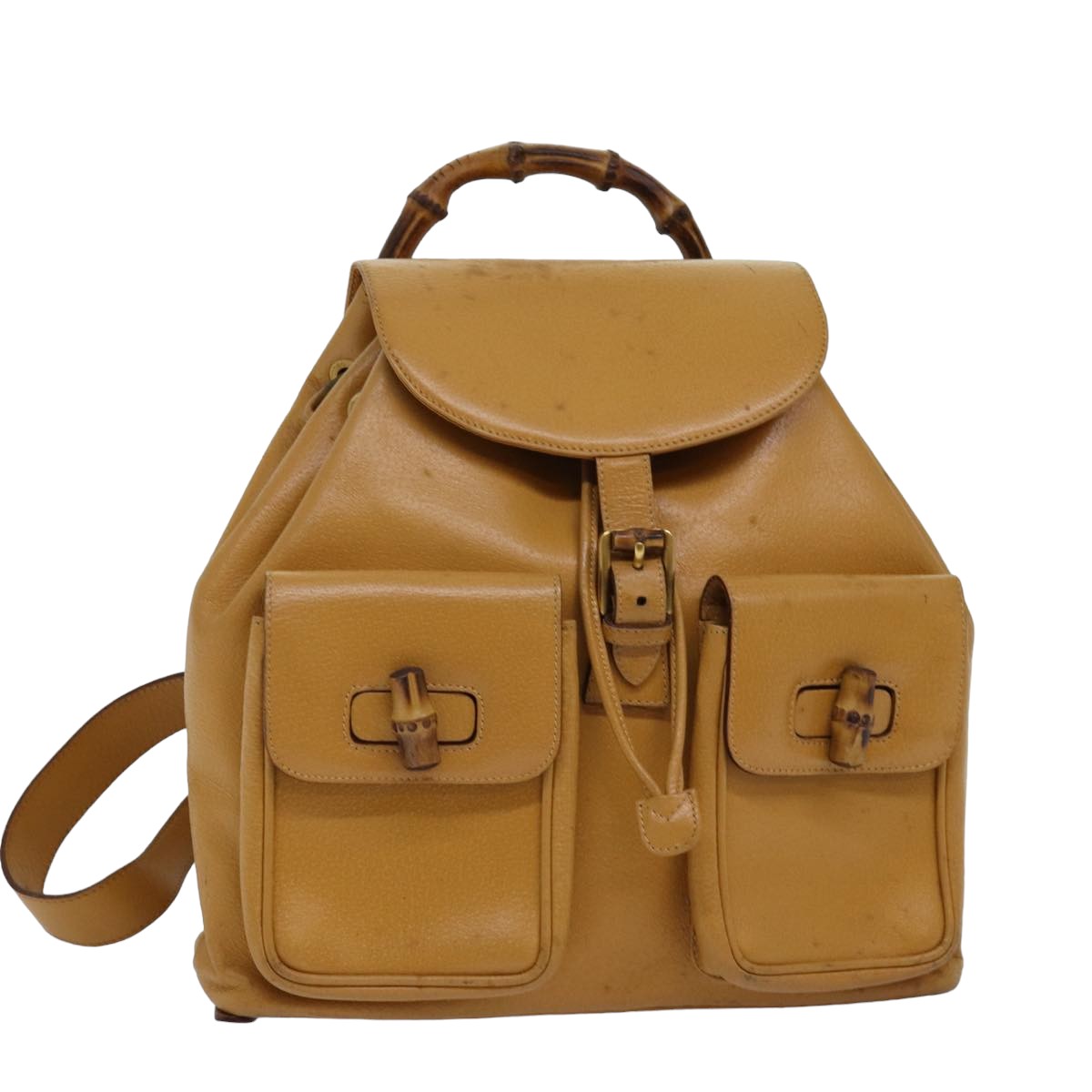 The Gucci Bamboo backpack is a striking accessory, crafted in Italy from vibrant yellow leather. Its unique design is highlighted by the iconic bamboo handle and practical backpack style, making it a standout piece in any collection.