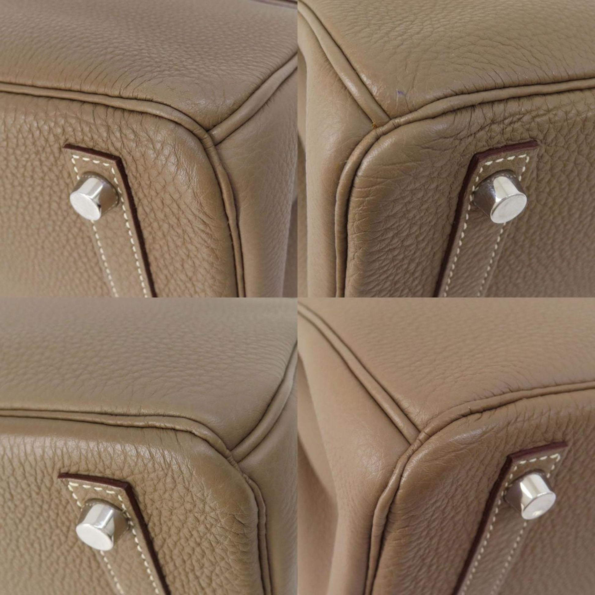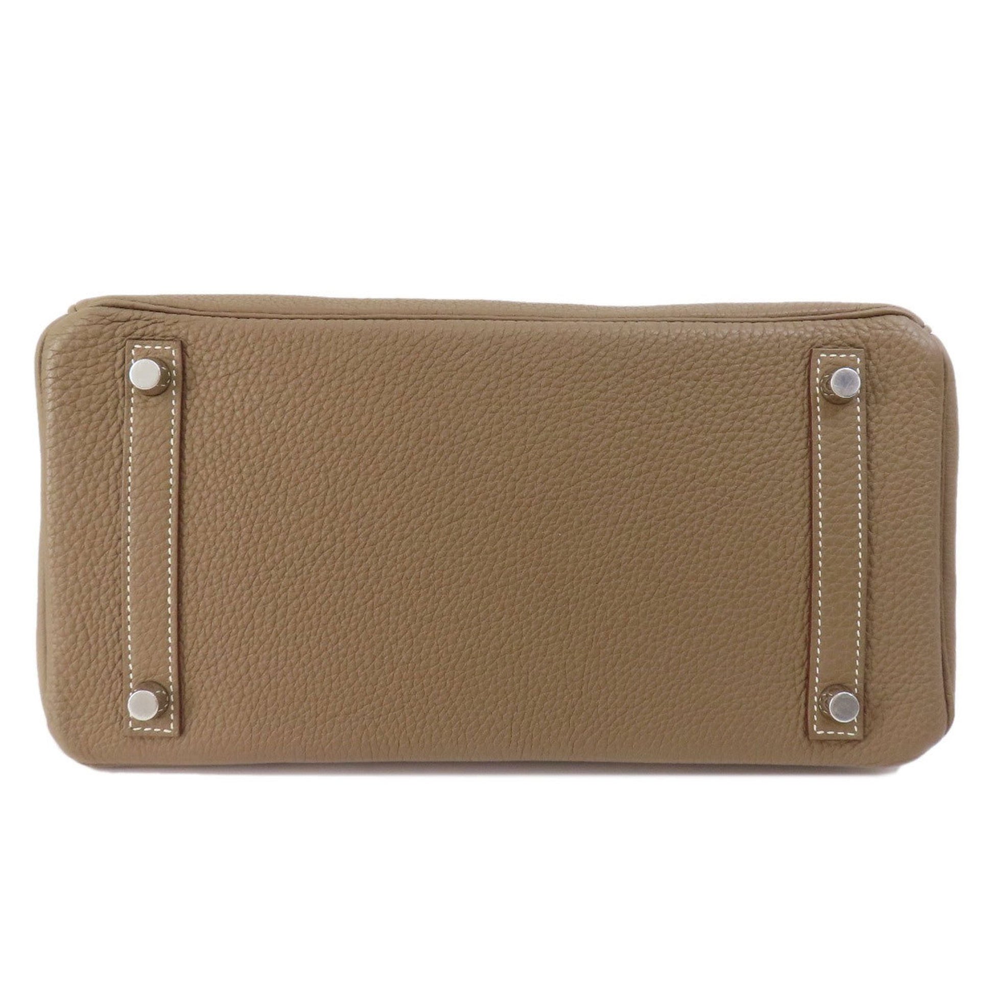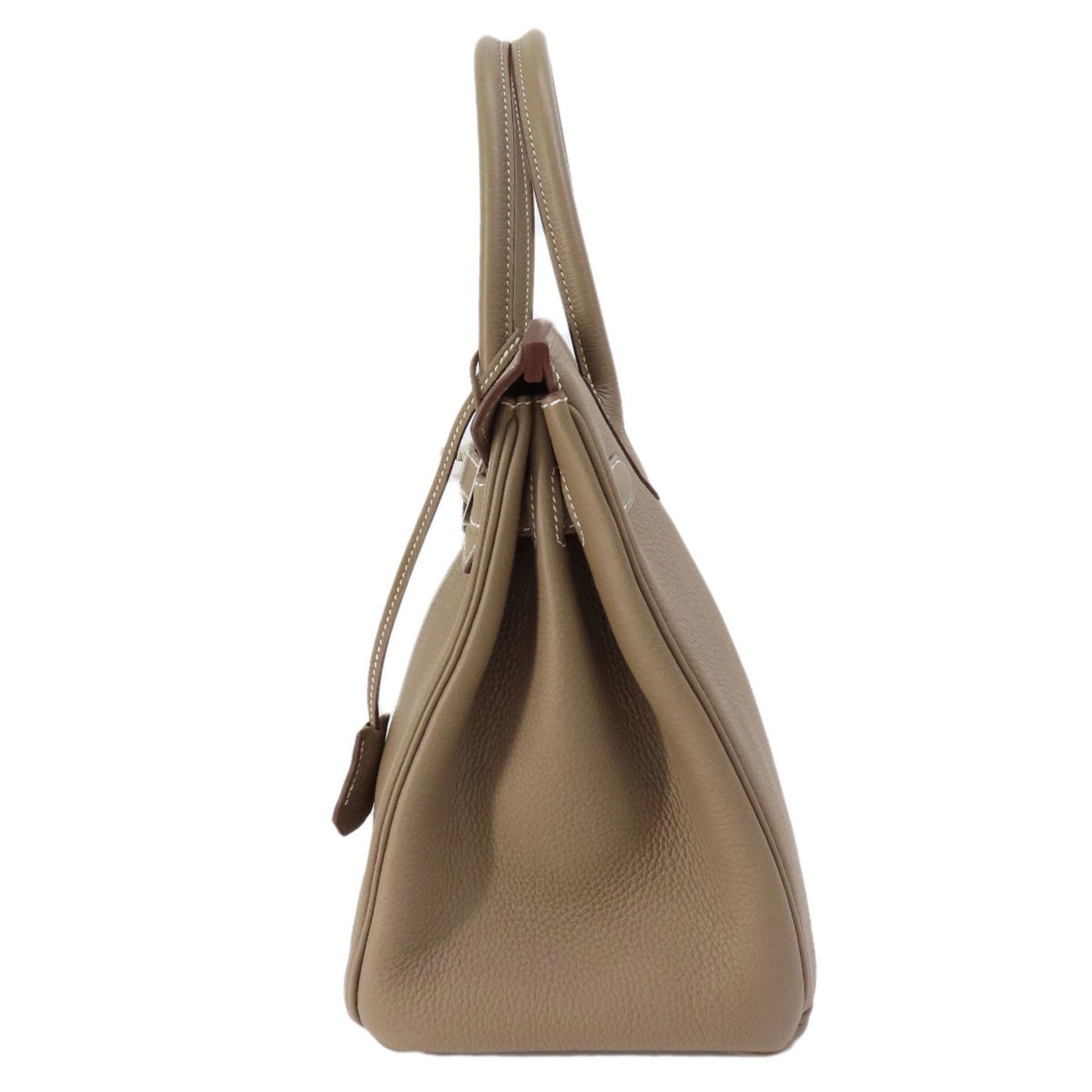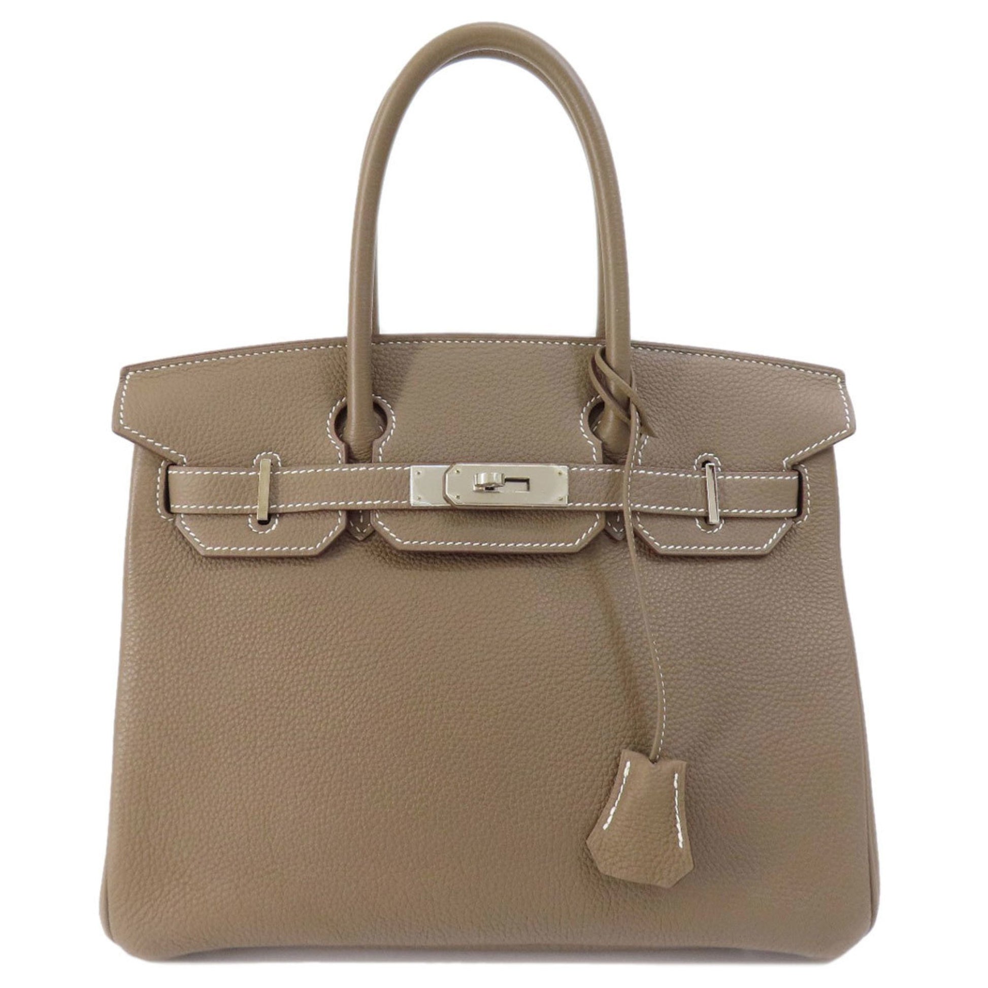 The Birkin 30 handbag, crafted from fine leather, is a luxurious accessory featuring coordinating leather handles and silver-tone metal hardware. Its flap closure resembles a padlock, adding both style and security to your personal belongings. Inside, the bag provides effortless organization with a zippered pocket and an open pocket. It is truly a treasure for those in search of an elegant and functional fashion accessory .
